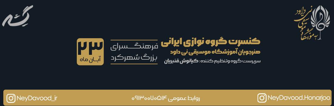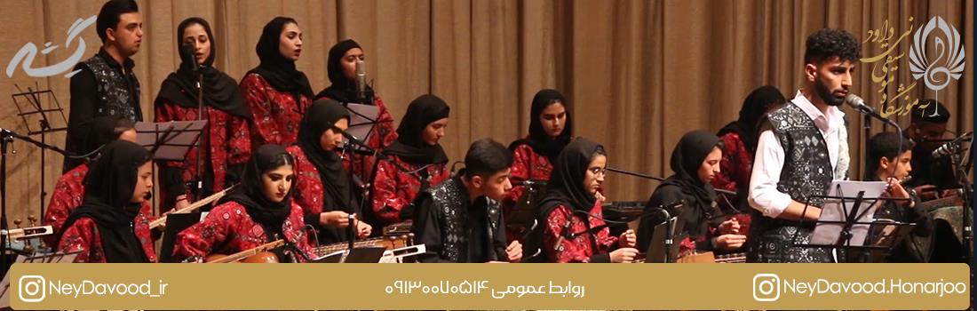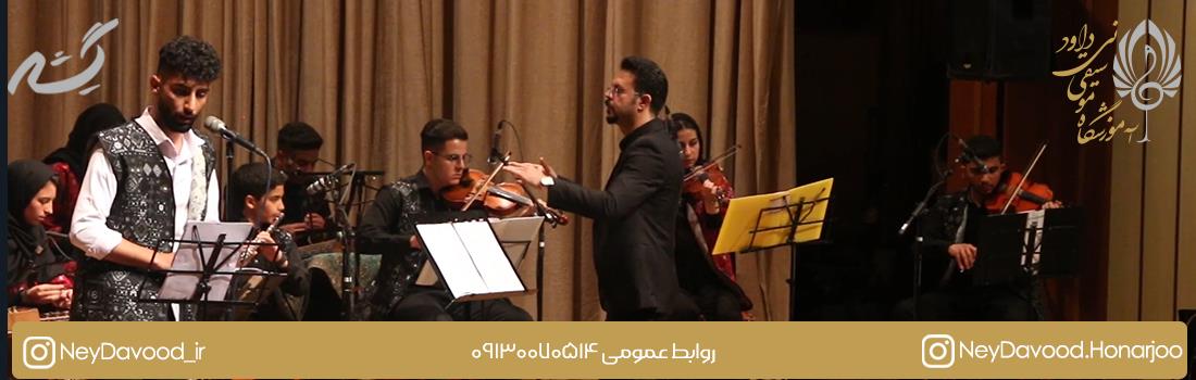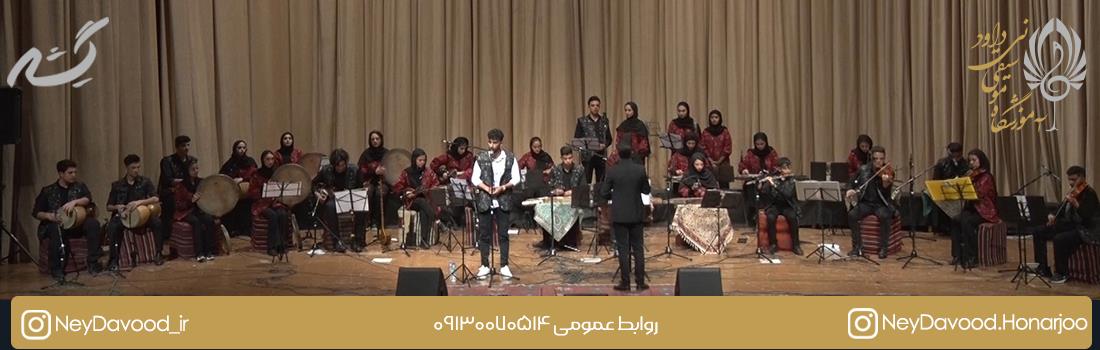 کنسرت گروه نوازی ایرانی آموزشگاه نی داود اجرای هنرجویان جوان و نوجوان آموزشگاه موسیقی نی داود شهرکرد تهیه کننده: وحید داودیان آموزشگاه موسیقی نی داود شهرکرد مدیر اجرایی: رحمان داودیان سرپرست گروه و تنظیم کننده: کیانوش قنبریان نوازندگان: مهسا قاسمی تار زهرا سلیمانی تار آرش میرزا خانی سه تار امیرعلی داودیان سه تار ابوالفضل نادریان سه تار علی رضایی کمانچه امیرمحمد مظاهری کمانچه پرستش پاکدل کمانچه ویانا جانکی سنتور آرنیکا شاهرخی سنتور مریم مخلصی سنتور فاطمه جعفری سنتور شیوا بابائی سنتور طاها رفیعی سنتور شاهین علائی سنتور کیانا سلطانی تنبک مریم فرج زاده تنبک ابوالفضل محمدی تنبک آویسا بلالی تنبک امید محمدقاسمی پیانو آرمین دهقانی ویلن محمدحسین غلامی ویلن امیرحسین شاهرخ همخوان هلنا رئیسی همخوان نوش آفرین صالحی همخوان افروز استادهادی همخوان مسعود امامی همخوان سامان جهانگرد همخوان دانیال عسگری همخوان رضا علی یاری نی تمنا کنعانی قانون کوثر کریمی دف